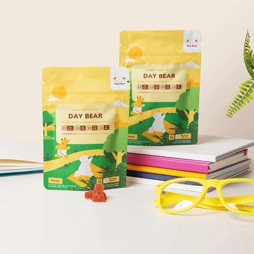 Day Bear is completely THC Free, which means no psychoactive effects or “high” sensations. Day Bear contains cannabinoids that produce a natural non-intoxicating sense of euphoria and wellness! Like a natural little pep to your step.